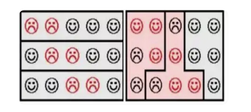 上圖是個(gè)簡(jiǎn)化的例子,通過(guò)不同的區(qū)域劃分,黑方在左圖的每個(gè)區(qū)域中都占據(jù)多數(shù),對(duì)紅方取得了3:0的優(yōu)勢(shì)。但按右圖的方式劃分,紅方反而取得了2:1的領(lǐng)先。