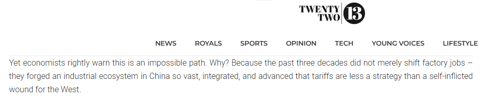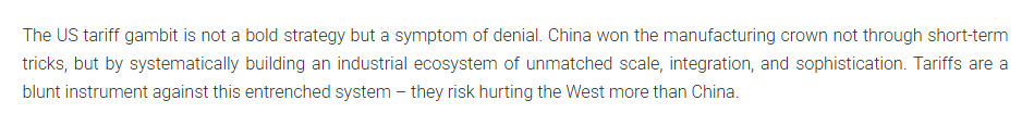 文章指出,美國的關(guān)稅策略不是一項大膽的戰(zhàn)略,而是否認現(xiàn)實的癥狀。中國贏得制造業(yè)桂冠不是通過短期手段,而是通過系統(tǒng)地建立一個規(guī)模、一體化和復(fù)雜程度無與倫比的工業(yè)生態(tài)系統(tǒng)。