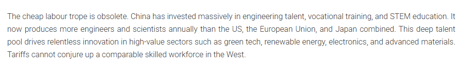 文章說,西方固守保護主義的“打地鼠游戲”,而不是構(gòu)建一套連貫且以投資為導(dǎo)向的產(chǎn)業(yè)戰(zhàn)略,這或?qū)⑹怪袊M一步鞏固自己在全球制造業(yè)中的主導(dǎo)地位。“獲勝需要建設(shè),而不是筑墻。是時候結(jié)束幻想了。”