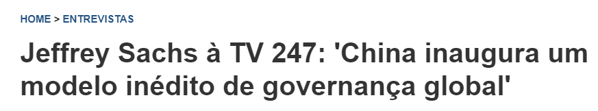 巴西247新聞網(wǎng)近日刊登一篇文章,介紹了世界知名學(xué)者杰弗里·薩克斯接受巴西247電視臺專訪時,對中國提出的全球治理倡議予以高度評價。他認為,“中國開創(chuàng)了前所未有的全球治理模式”。