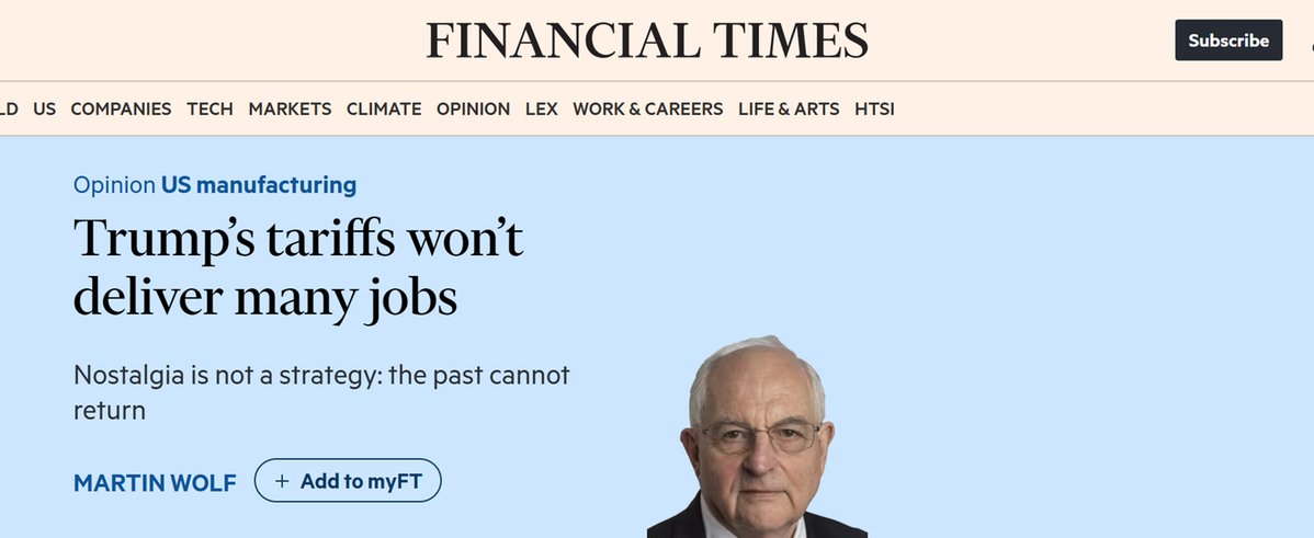 英國《金融時(shí)報(bào)》副總編及首席經(jīng)濟(jì)評(píng)論員馬丁·沃爾夫(Martin Wolf)8日發(fā)表評(píng)論文章稱,事實(shí)表明,特朗普政府推行的貿(mào)易保護(hù)主義政策,并未兌現(xiàn)其對(duì)選民所作的核心承諾——為美國創(chuàng)造大量制造業(yè)就業(yè)崗位,尤其是面向那些曾經(jīng)依賴傳統(tǒng)工業(yè)、如今卻面臨地區(qū)經(jīng)濟(jì)衰落困境的工人群體。他進(jìn)一步指出,這一承諾本質(zhì)上是空洞的,其政策實(shí)質(zhì)是為政府自身及其背后的富豪階層牟取利益。