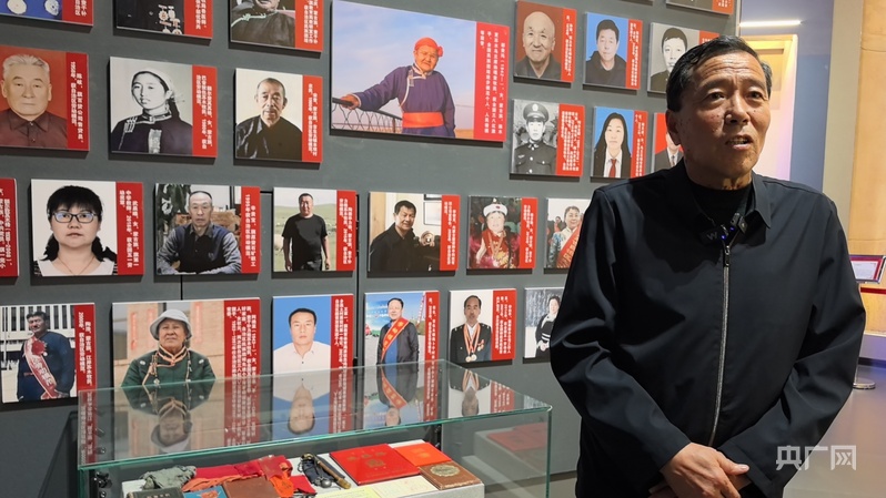 9月4日,淅淅瀝瀝的雨下個(gè)不停。下午三時(shí)許,孫保衛(wèi)來到四子王旗博物館展廳,在“人民楷?!倍假F瑪展區(qū)駐足良久。他是都貴瑪額吉養(yǎng)育的28個(gè)“國家的孩子”中年齡最小的一個(gè)。
