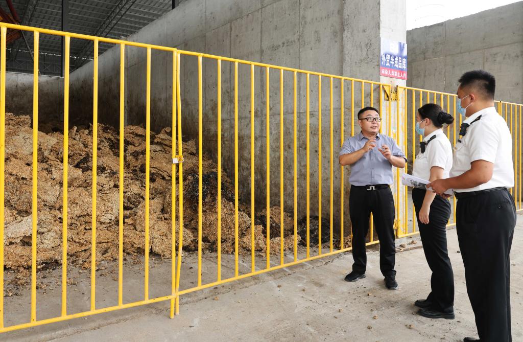 5月28日,在海南象元實(shí)業(yè)有限公司,企業(yè)人員向??诤jP(guān)所屬三亞海關(guān)關(guān)員介紹企業(yè)進(jìn)口的橡膠原材料。新華社記者金皓原 攝