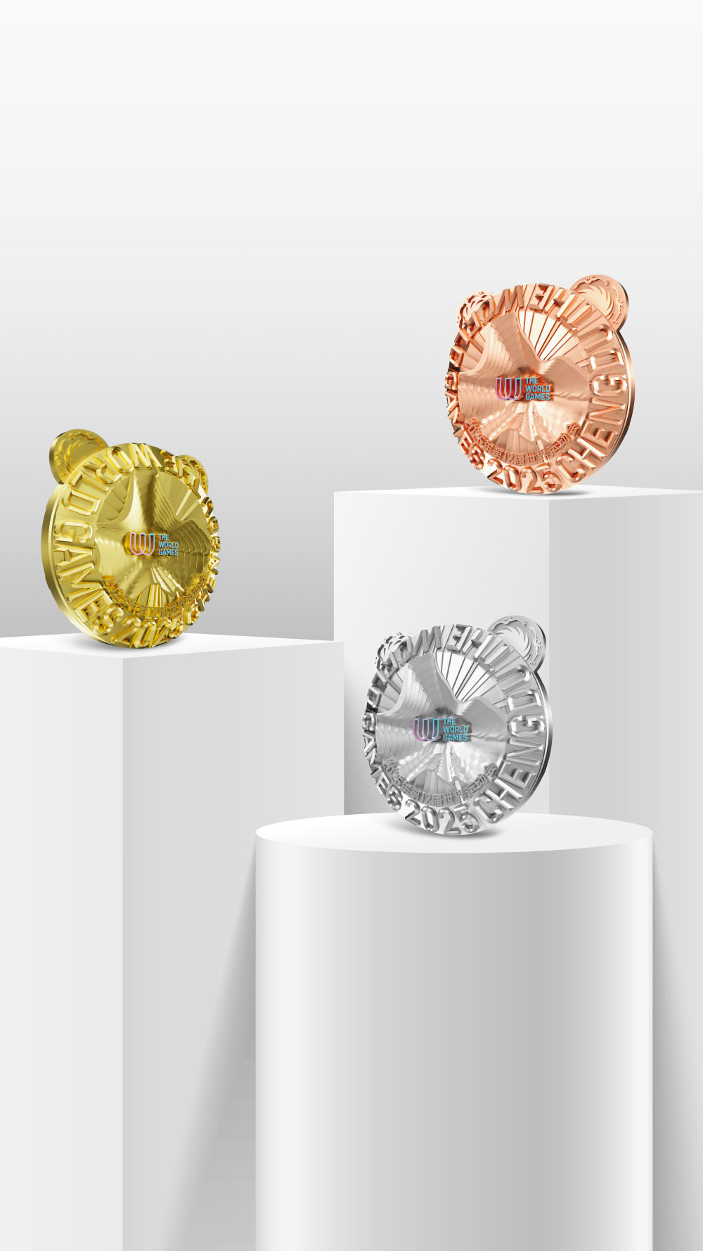 “竹光”獎牌正面居中的是國際世界運動會協(xié)會會徽,賽事中英文名稱環(huán)繞呼應(yīng)。巧妙融入的太陽神鳥紋飾,與暗合城市輪廓的流動凹凸線條,在底部營造出層層光芒,既彰顯中華文明、巴蜀文化的璀璨歷史,更象征著運動精神永恒閃耀。
