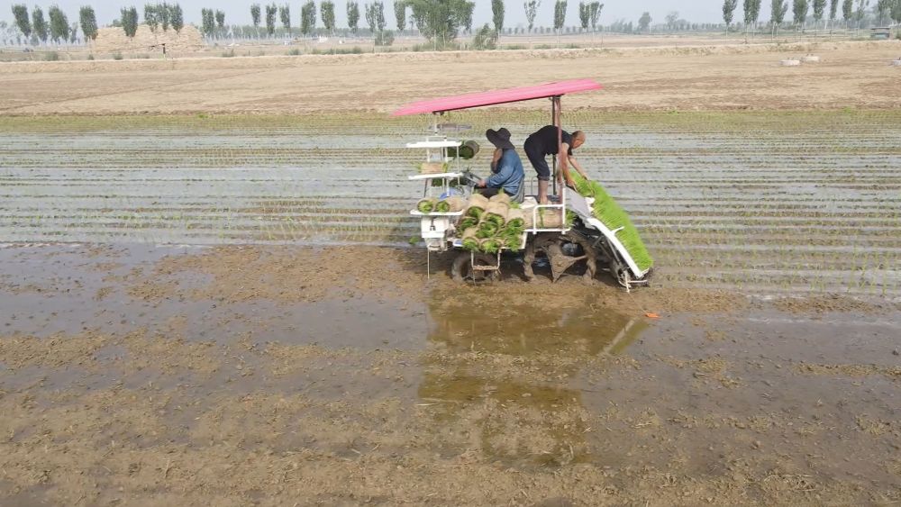 在河南省新鄉(xiāng)市原陽縣太平鎮(zhèn),種植戶們?cè)诓逖頇C(jī)的助力下,搶抓農(nóng)時(shí),進(jìn)行水稻插秧。受訪者供圖