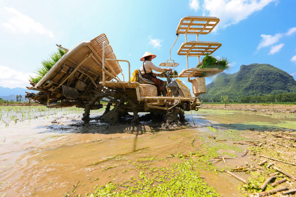 6月13日,在湖南省湘西土家族苗族自治州龍山縣召市鎮(zhèn)前衛(wèi)村,農(nóng)機(jī)手駕駛插秧機(jī)進(jìn)行插秧。新華社發(fā)(曾祥輝 攝)