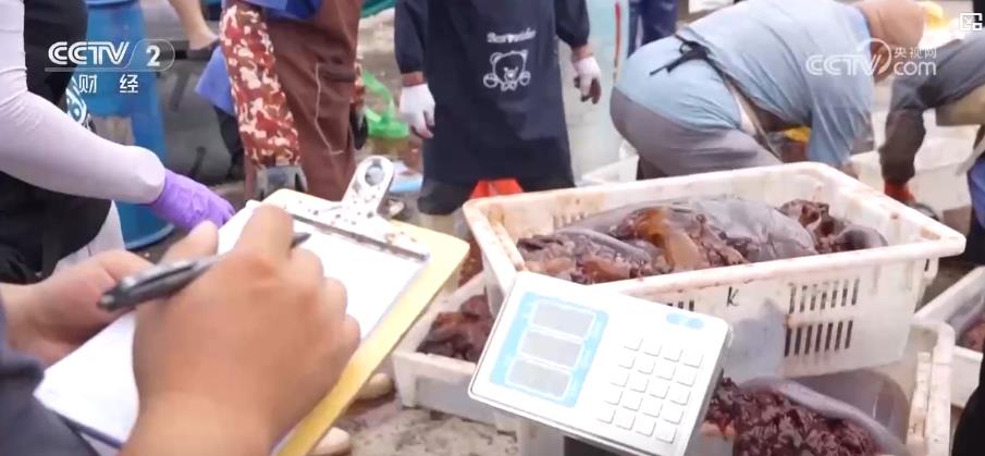 在南漁港碼頭,漁船剛一???,漁民們便爭(zhēng)分奪秒地卸貨、稱重。今年,在煙臺(tái)龍口海蜇專項(xiàng)捕撈期,共有41艘漁船成功辦理了海蜇專項(xiàng)捕撈許可證,得以出海作業(yè)。
