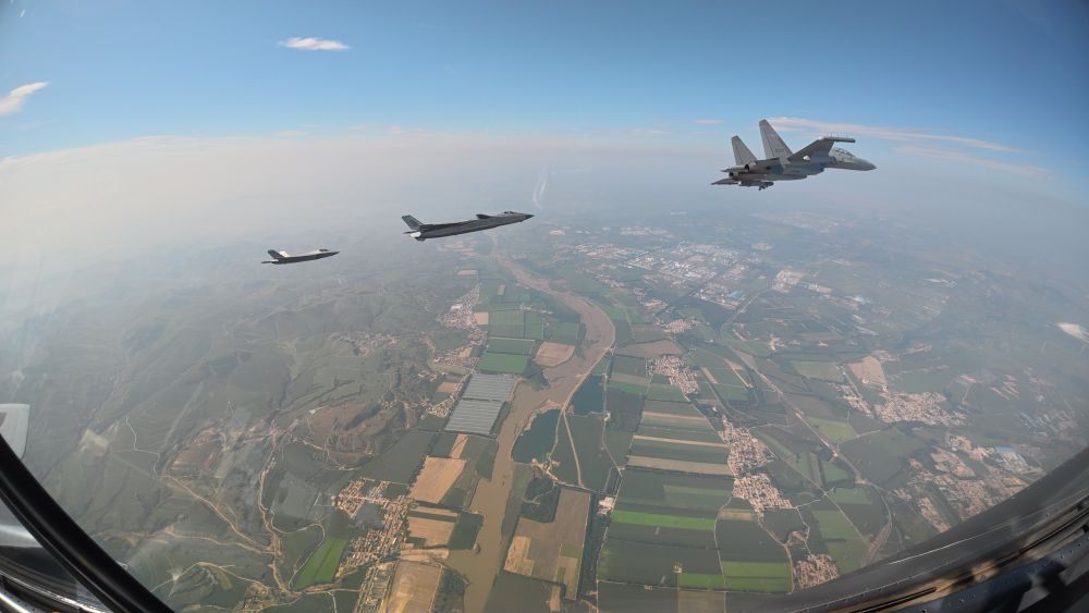 ↑這是殲擊機(jī)梯隊(duì)從北京城區(qū)上空飛過(guò)。