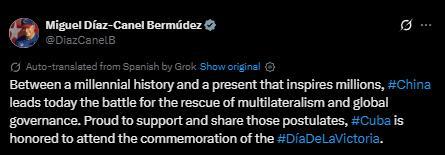 迪亞斯-卡內(nèi)爾在社交媒體上發(fā)文稱,“在綿延千年的歷史與激勵(lì)億萬(wàn)人的當(dāng)下之間,中國(guó)今日引領(lǐng)捍衛(wèi)多邊主義與全球治理的斗爭(zhēng)。古巴為支持并踐行這些理念而自豪,并榮幸出席勝利日紀(jì)念活動(dòng)。”