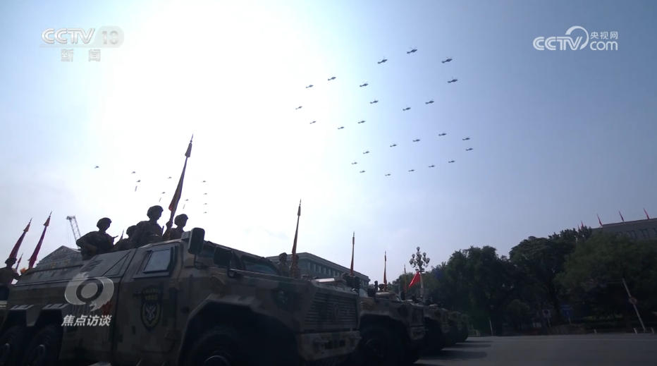 藍(lán)天之上,轟鳴聲持久不息,由26架直-19型武裝直升機(jī)組成的“80”字樣編隊向天安門飛來,寓意紀(jì)念中國人民抗日戰(zhàn)爭暨世界反法西斯戰(zhàn)爭勝利80周年。