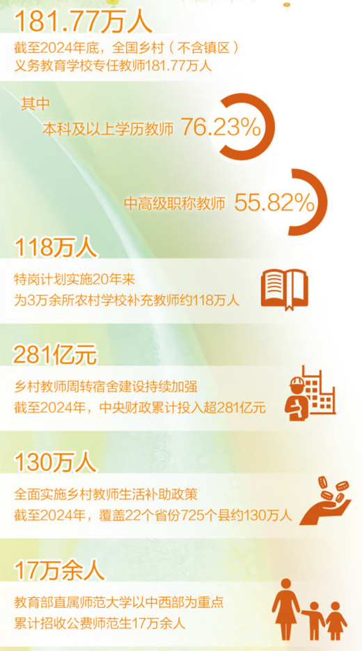 這是真金白銀的投入。2024年,特崗教師工資性補(bǔ)助再次提標(biāo),每人每年增加3600元;鄉(xiāng)村教師生活補(bǔ)助政策深入實(shí)施,受益教師約130萬人,人均月補(bǔ)助金額約400元;鄉(xiāng)村教師周轉(zhuǎn)宿舍建設(shè)持續(xù)加強(qiáng),中央財(cái)政累計(jì)投入超281億元,建設(shè)約63.7萬套。