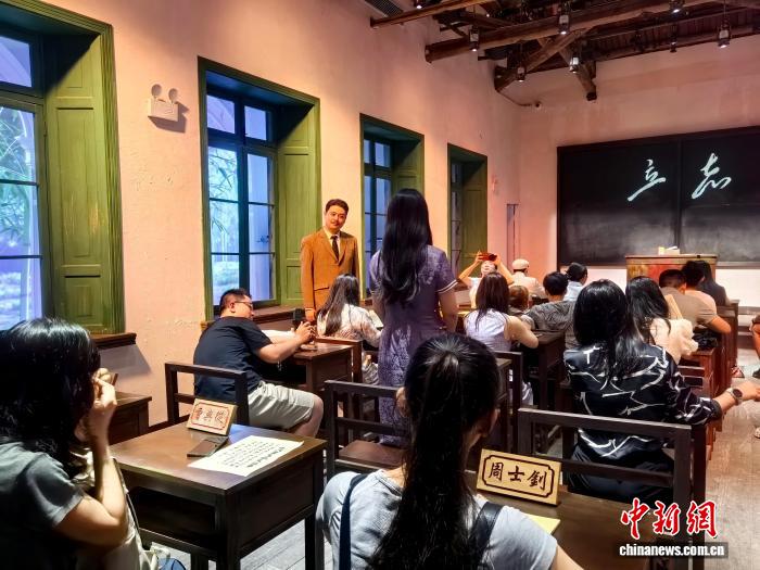 9月5日,位于長沙橘子洲的《恰同學(xué)少年》沉浸式青春劇場,“楊昌濟(jì)”飾演者與觀眾王子悅(紫衣)互動(dòng)?!堁┯?攝