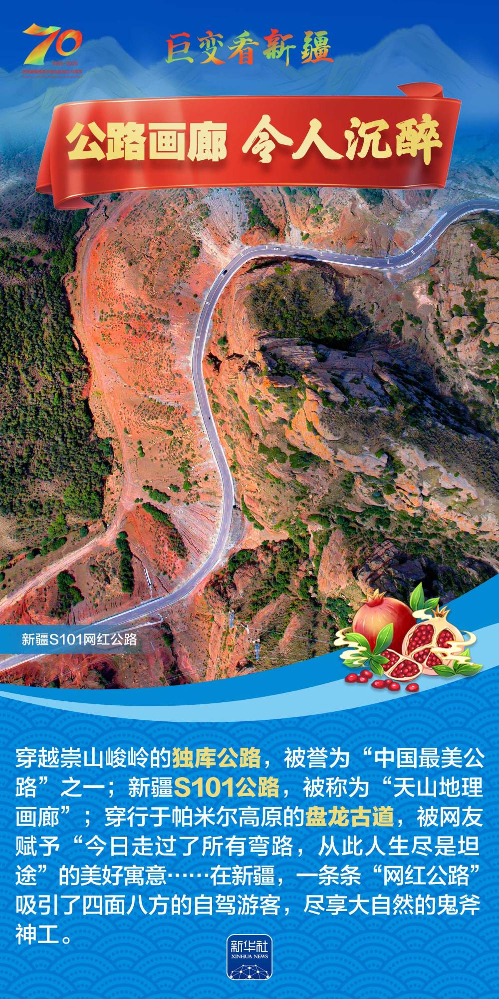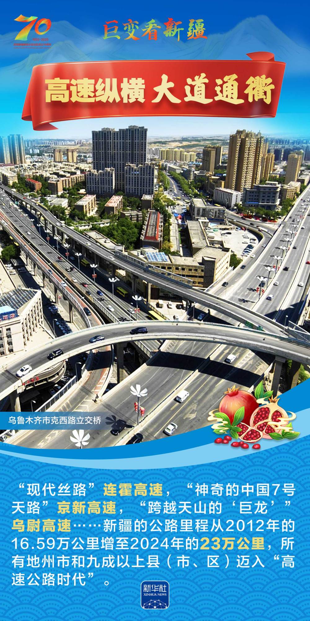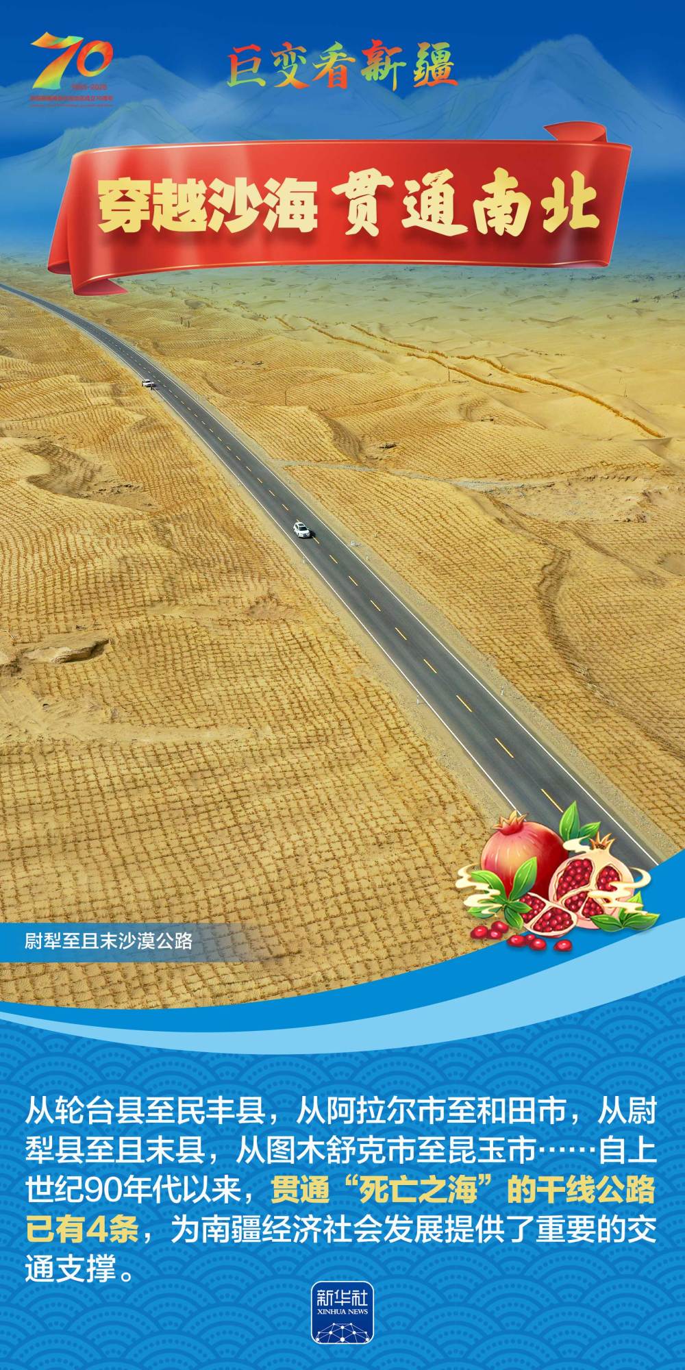 今年是新疆維吾爾自治區(qū)成立70周年。70年來,新疆的交通建設(shè)日新月異。從駝鈴聲聲、馬蹄嘚嘚到鐵流縱橫、銀鷹高翔,一座座交通樞紐輻射四方,一條條“鋼鐵巨龍”蜿蜒逶迤,一個個支線機(jī)場星羅棋布,現(xiàn)代化的新疆立體交通網(wǎng)絡(luò)日益形成。讓我們跟隨這組海報,一起見證穿越“三山兩盆”、貫通歐亞大陸的新時代新疆交通畫卷。