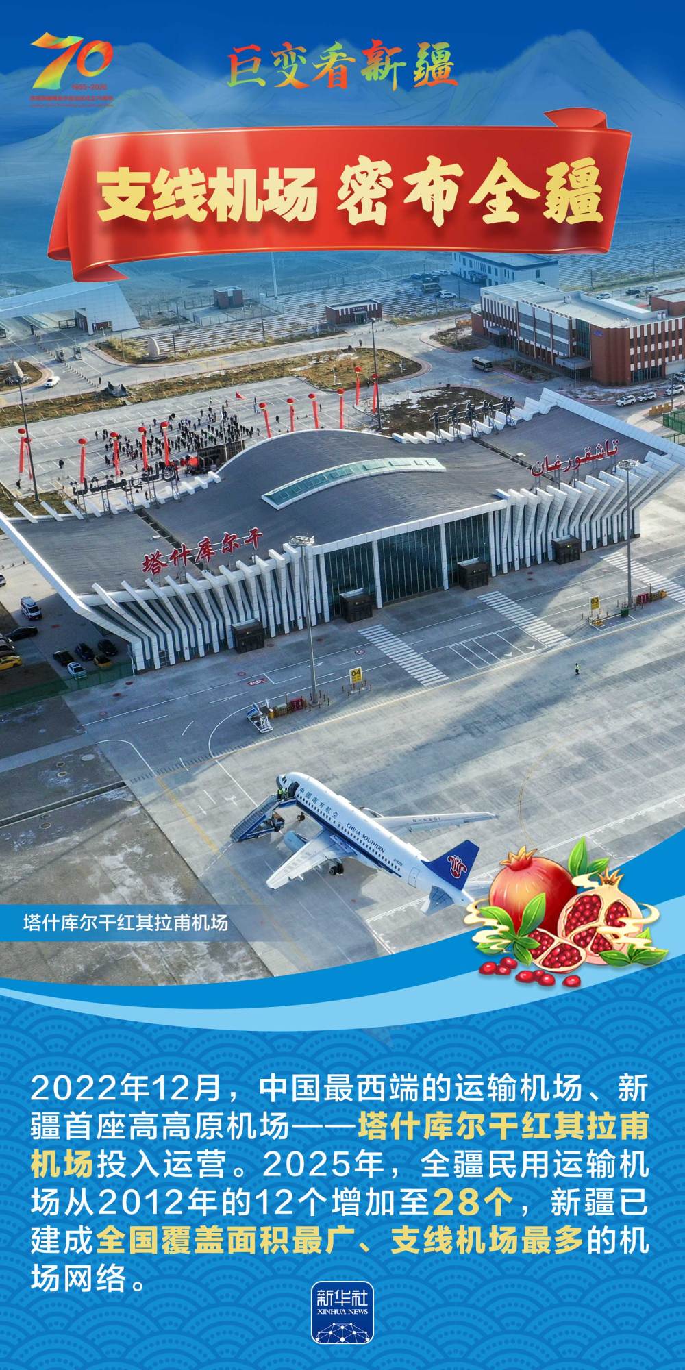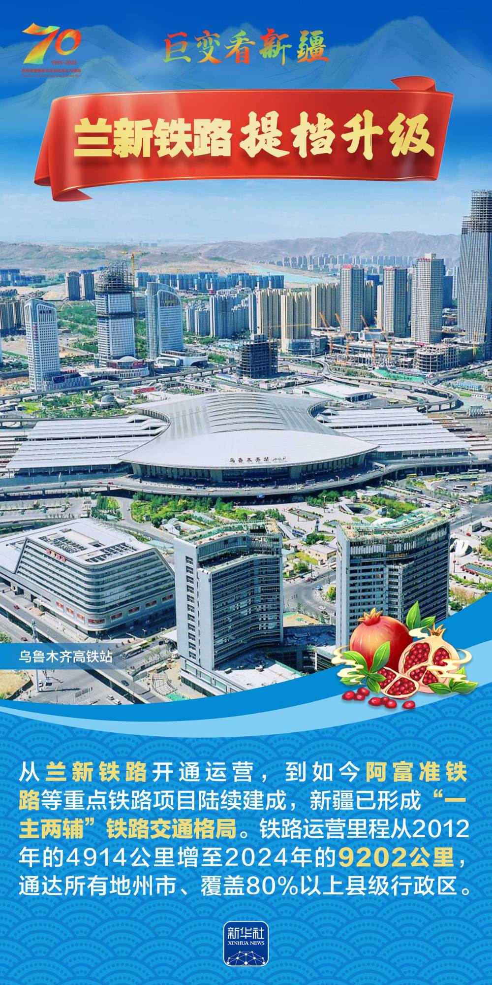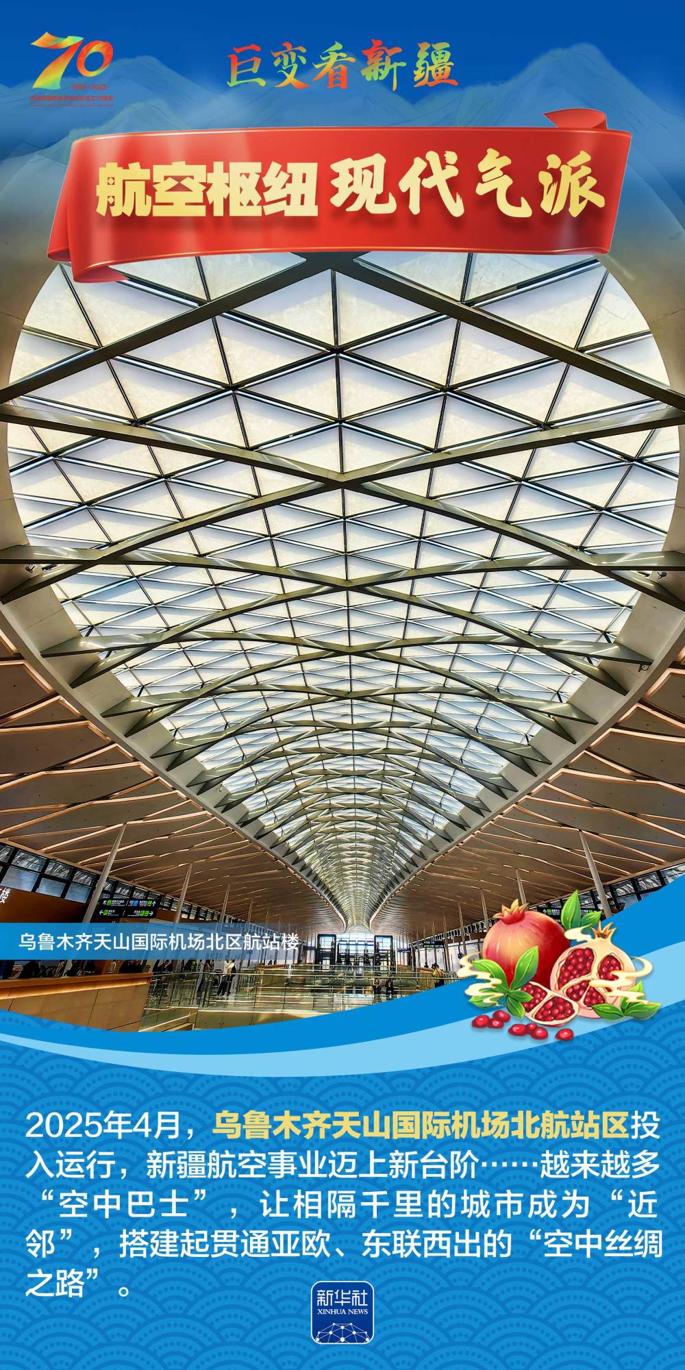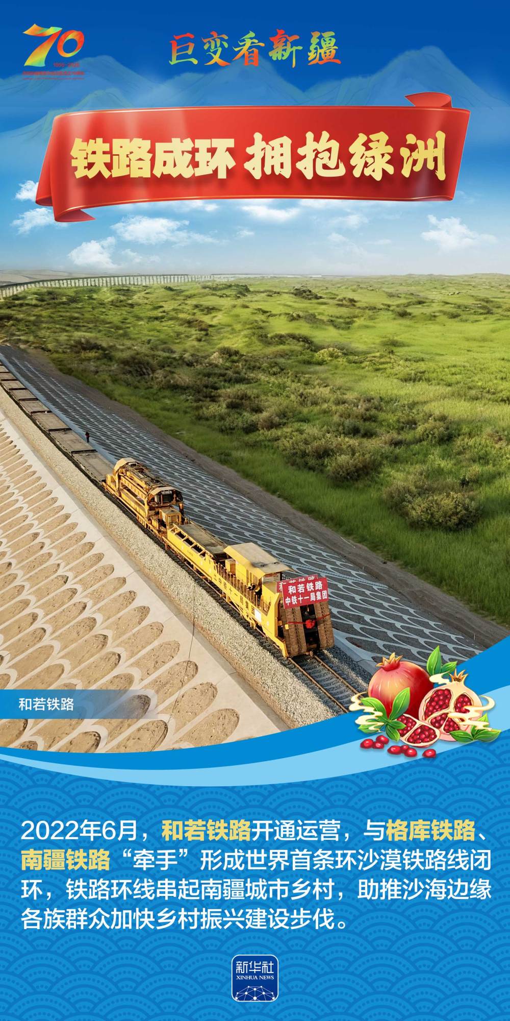 今年是新疆維吾爾自治區(qū)成立70周年。70年來,新疆的交通建設(shè)日新月異。從駝鈴聲聲、馬蹄嘚嘚到鐵流縱橫、銀鷹高翔,一座座交通樞紐輻射四方,一條條“鋼鐵巨龍”蜿蜒逶迤,一個個支線機(jī)場星羅棋布,現(xiàn)代化的新疆立體交通網(wǎng)絡(luò)日益形成。讓我們跟隨這組海報,一起見證穿越“三山兩盆”、貫通歐亞大陸的新時代新疆交通畫卷。