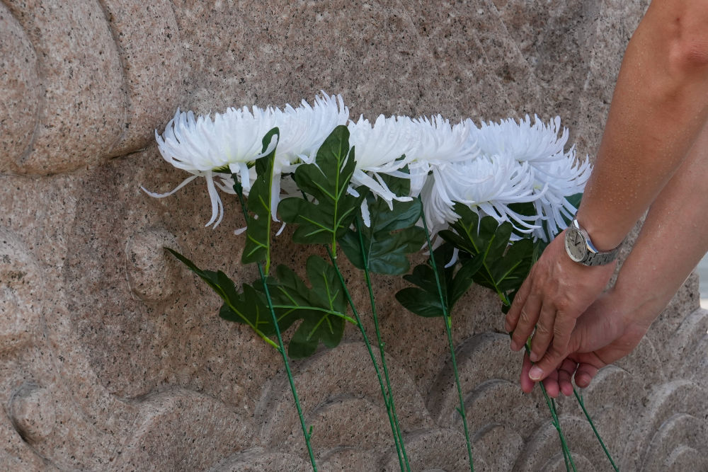 2025年7月7日,觀眾在南京抗日航空烈士紀(jì)念館紀(jì)念碑前獻花,緬懷英烈。新華社記者 李博 攝
