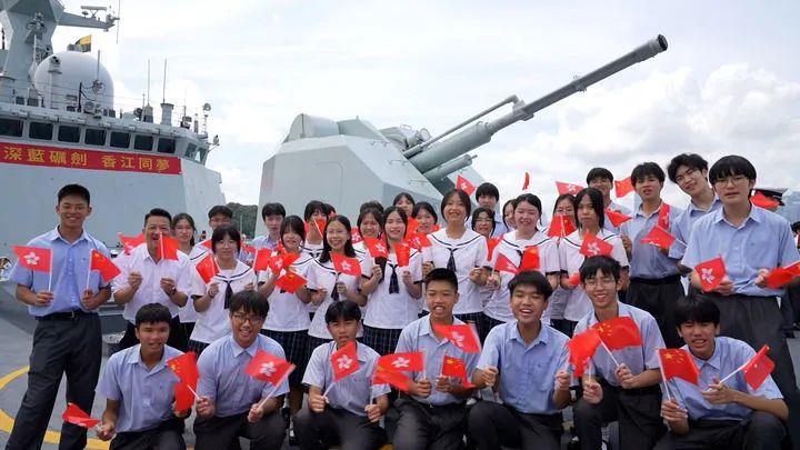 2025年7月3日,中國海軍山東艦航母編隊抵達香港。香港中學(xué)生登上海軍運城艦參觀、留影。