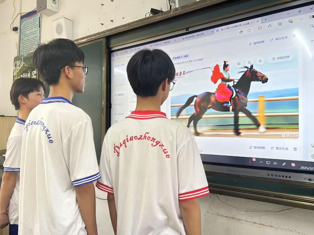 3月3日,廣西容縣容州鎮(zhèn)都嶠中學(xué)學(xué)生觀看老師使用人工智能大模型生成的海報(bào),感受語文課堂的互動創(chuàng)新。(陳春仲 攝)