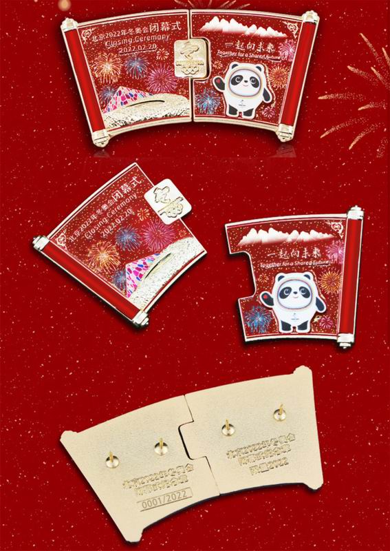 “來日方長” 北京2022年冬奧會閉幕式紀念徽章一套兩枚,拼合在一起就形成了一個漂亮的卷軸,寓意雖然北京冬奧會圓滿閉幕,但奧運精神薪火相傳,來日方長?;照虏馁|(zhì)為鋅合金,采用釉面彩繪、立體浮雕、立體分層等工藝,每個產(chǎn)品均雕刻獨立序列號,高5cm、寬9.3cm、厚3mm,紙盒包裝,限量2022套。