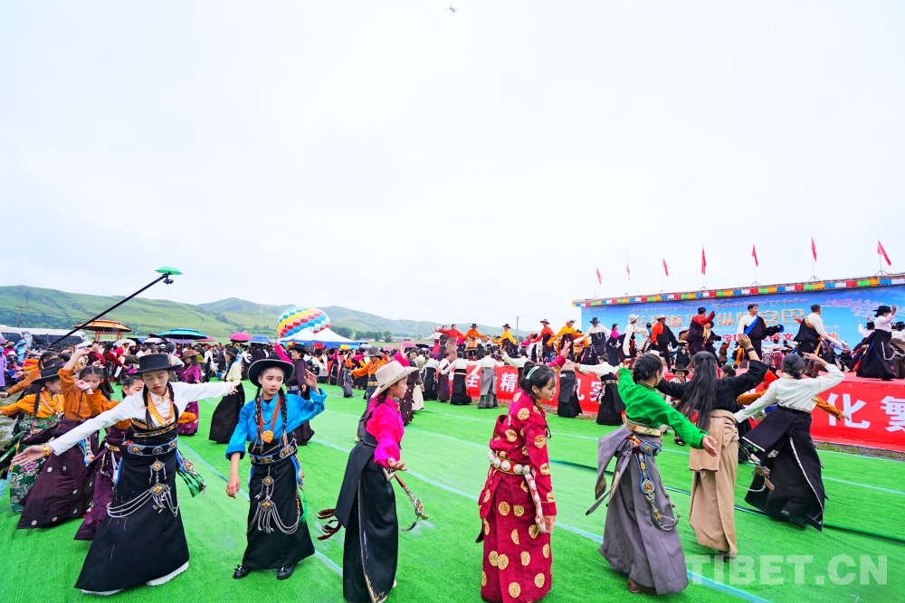 一場傳統(tǒng)的祈福儀式拉開活動的序幕。身著盛裝的騎手擎著彩旗,策馬轉(zhuǎn)繞祈福的煨桑臺,共同祝愿祖國繁榮昌盛,祝福家鄉(xiāng)安定祥和,各族人民團(tuán)結(jié)進(jìn)步。少兒服飾隊和300名當(dāng)?shù)厝罕娛峙豕_(dá)悉數(shù)亮相在舞臺前,向四方來客表示誠摯歡迎?!百愸R”“吉祥大鍋莊”等民族歌舞精彩上演,游客也加入其中跳起團(tuán)結(jié)鍋莊,盡享盛夏安巴之樂。