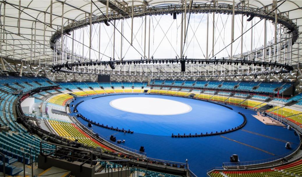 圖為第十二屆全國少數(shù)民族傳統(tǒng)體育運(yùn)動(dòng)會開幕式前繁忙的三亞市體育中心體育場 攝影:劉莉