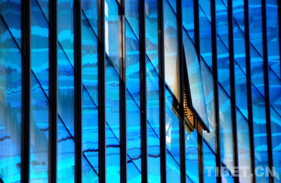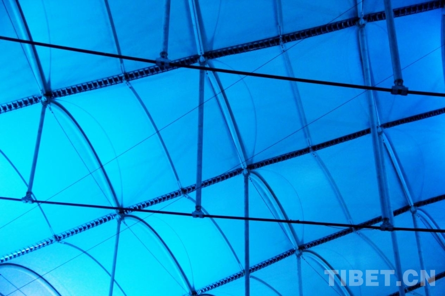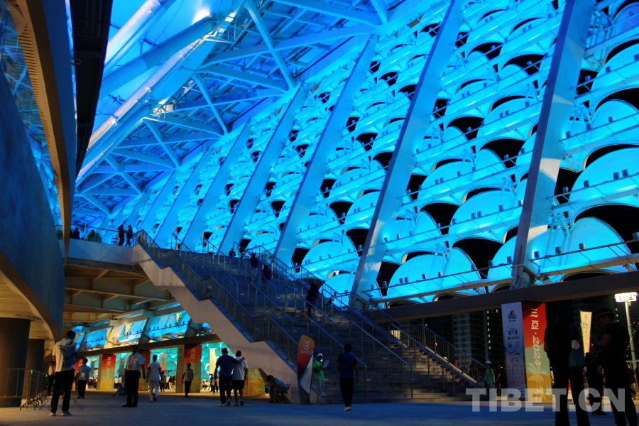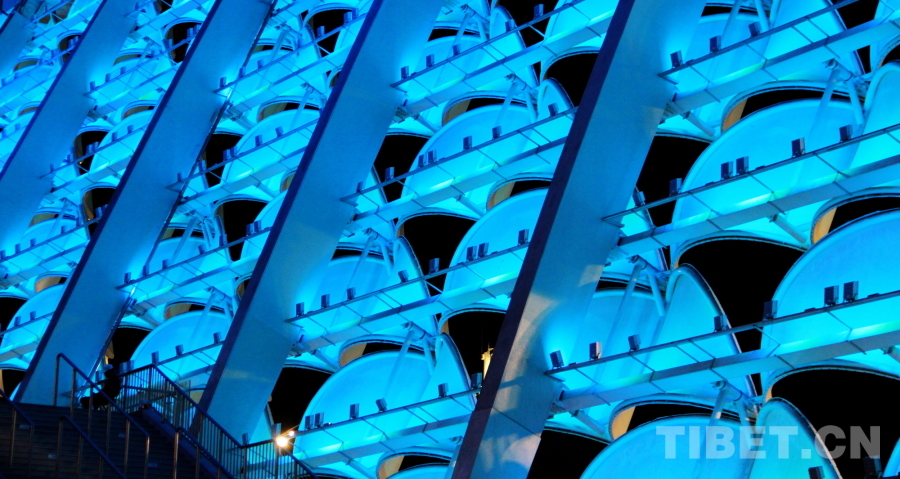 圖為三亞市體育中心體育場內(nèi)部的玻璃結(jié)構(gòu)反射的藍(lán)色燈光 攝影:劉莉