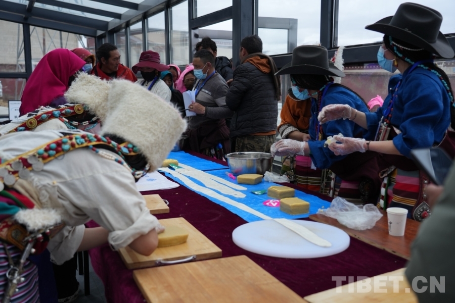 圖為“拉拉”和“推”制作現(xiàn)場(chǎng)。“拉拉”和“推”是藏北獨(dú)具特色的一種高品質(zhì)乳制品,它可以給牧民提供極高的營(yíng)養(yǎng),是招待客人和饋贈(zèng)親朋好友的食物之一。