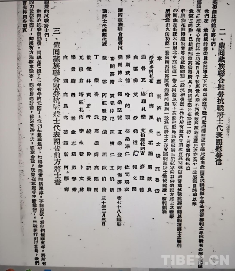 圖為《蒙回藏族聯(lián)合慰勞抗戰(zhàn)將士代表團(tuán)告前方將士書(shū)》(喜饒尼瑪供圖)