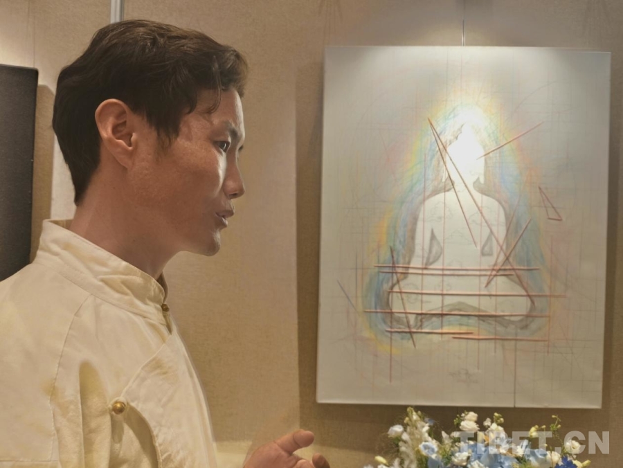 圖為5月2日至8日舉行的“三國(guó)同框 四季如畫(huà) 五彩亞?wèn)|——亞?wèn)|縣文化交流及特色產(chǎn)品展銷(xiāo)活動(dòng)”上,亞?wèn)|青年藝術(shù)家索喃次仁在介紹他的作品 攝影:趙釗