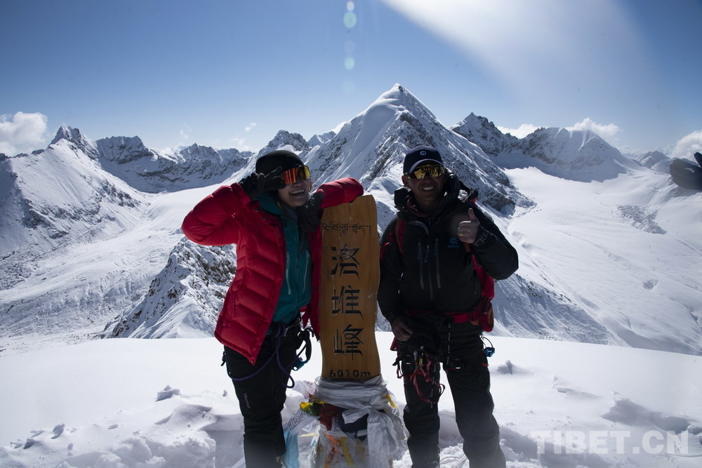 圖為5月3日,來(lái)自上海的登山愛好者登頂洛堆峰后與自己的登山向?qū)Ш嫌啊z影:趙振宇
