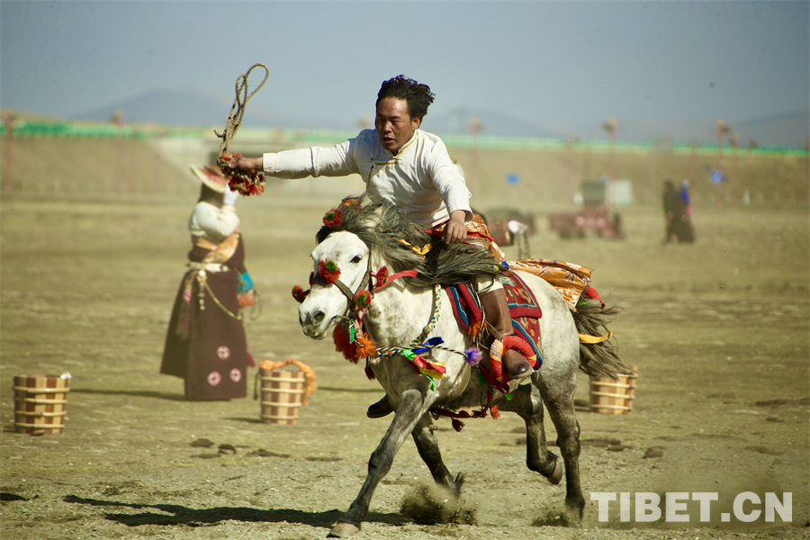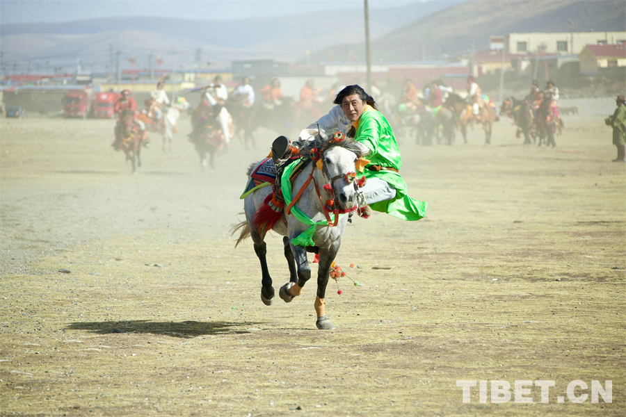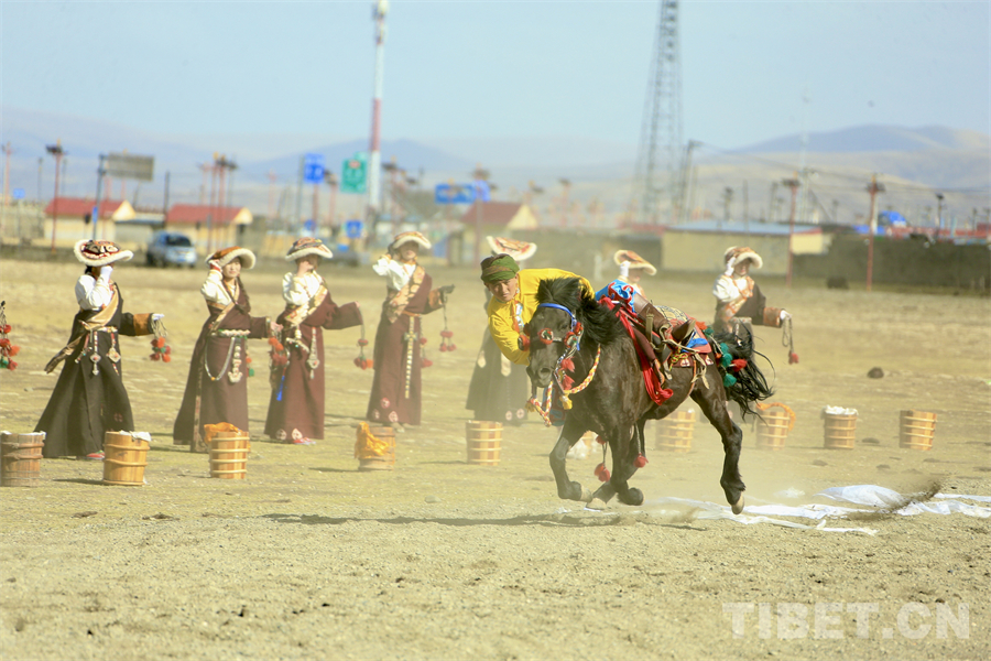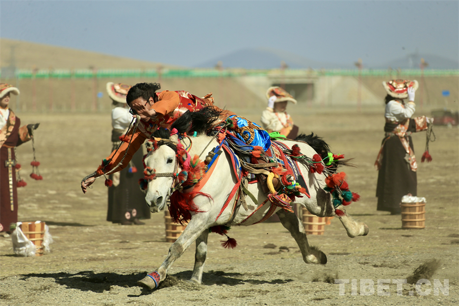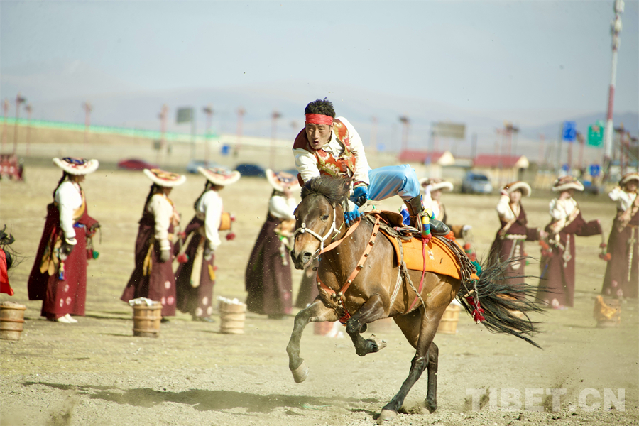 在海拔4000米左右的遼闊天地間,康巴漢子們駕馭著矯健的駿馬、身著華美的傳統(tǒng)服飾,如疾風(fēng)般掠過金色的草原,在馬背上展示跑馬射箭、乘馬射擊、跑馬拾哈達(dá)、跑馬倒立、跑馬懸體等高難度動作,馬蹄聲聲、歡呼陣陣,交織成高原最豪邁的樂章。(中國西藏網(wǎng) 記者/畢然 龍真多吉)