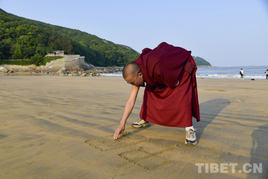 圖為西藏佛學(xué)院學(xué)員在東海岸邊寫下中國(guó)二字 攝影:趙振宇