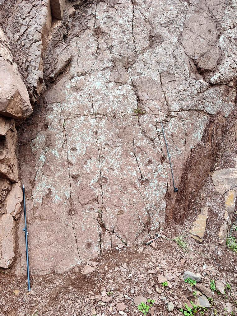 恐龍研究專家、中國地質(zhì)大學(xué)(北京)副教授邢立達(dá)介紹,昌都所在的侏羅紀(jì)地層最大厚度超4800米,產(chǎn)出了大量恐龍足跡化石。2023年7月,中國地質(zhì)調(diào)查局相關(guān)人員在此開展化石遺跡調(diào)查時(shí),意外發(fā)現(xiàn)疑似爬行動(dòng)物腳印的巖石石壁,后與中國地質(zhì)大學(xué)(北京)展開合作。
