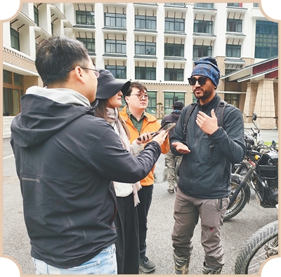 記者在吉隆縣吉隆鎮(zhèn)采訪尼泊爾人巴斯內特(右一)。環(huán)球時報記者 趙覺珵攝