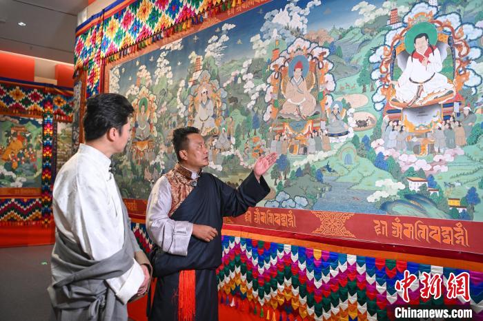 唐卡是藏民族獨特的藝術形式,承載千年信仰與智慧,是世界非物質文化遺產明珠。本次展覽的核心展品《吐蕃贊普世系大唐卡金子明鏡》尤為引人注目。該唐卡寬1.8米、長200米,由平措多布杰大師等30多位孜東唐卡畫師歷經9年繪制完成。它依據史實,描繪了文成公主和金城公主入藏、長慶會盟等重要事件,生動呈現各民族在文化、政治、經濟等方面的交流交融,是孜東唐卡藝術保護成果。