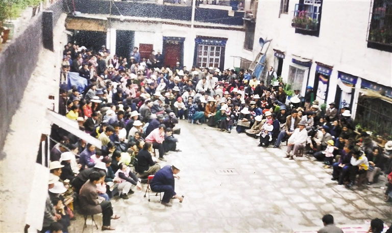 在當(dāng)時(shí)拍的另一張照片上,幾十位居民擠在過(guò)道里準(zhǔn)備投票。“那時(shí)候院子小,選舉時(shí)得側(cè)著身子站。”德吉卓嘎回憶道,“院子窄小,雨天積水,但絲毫不影響大家參與社區(qū)事務(wù)的熱情?!闭掌囊唤?,13歲的普布普赤正躲在母親身后好奇張望,如今她41歲,已成長(zhǎng)為大院的戶長(zhǎng)。