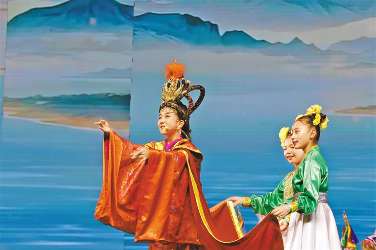舞臺中央,12歲的其美卓嘎身著錦繡華服,以清亮唱腔和靈動演繹,將文成公主的溫婉堅毅展現(xiàn)得淋漓盡致?!爱斘掖┥蠎蚍?、唱起‘漢藏情誼潔如璧’時,仿佛真的穿越到千年前的和親之路。”演出結(jié)束后,小姑娘眼中閃爍著興奮的光芒,“原來民族團結(jié)的故事,就藏在這些古老而動人的戲文里?!逼涓赣H倫珠難掩自豪:“文成公主促進了漢藏交融,女兒能表演這個節(jié)目,用藏戲詮釋民族團結(jié),是我們?nèi)业尿湴?!?/p>