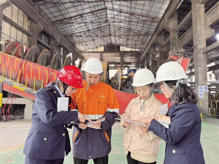 稅務(wù)工作人員在礦山企業(yè)生產(chǎn)經(jīng)營(yíng)場(chǎng)所開展稅費(fèi)宣傳。圖由自治區(qū)稅務(wù)局提供