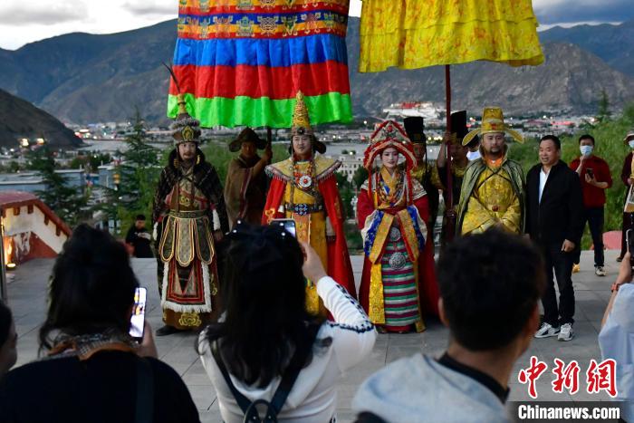 圖為《文成公主》大型實(shí)景劇演員在文成公主藏文化風(fēng)情園巡游,與游客互動(dòng)。李林 攝