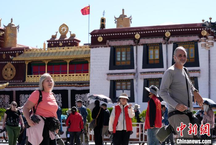 圖為外國游客在大昭寺廣場(chǎng)游覽。中新社記者 李林 攝