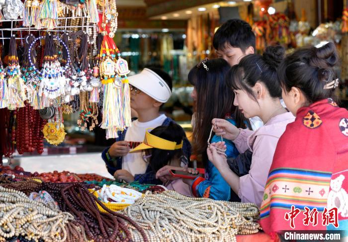 圖為游客在八廓街選購旅游紀(jì)念品。中新社記者 李林 攝