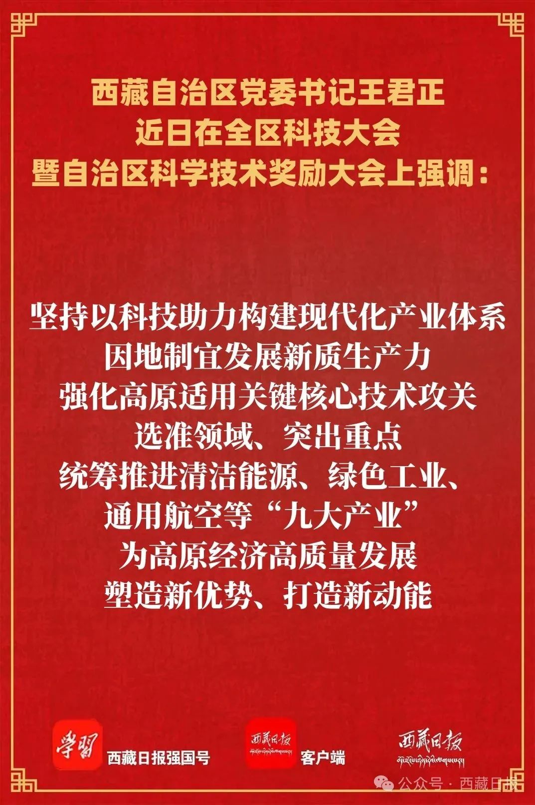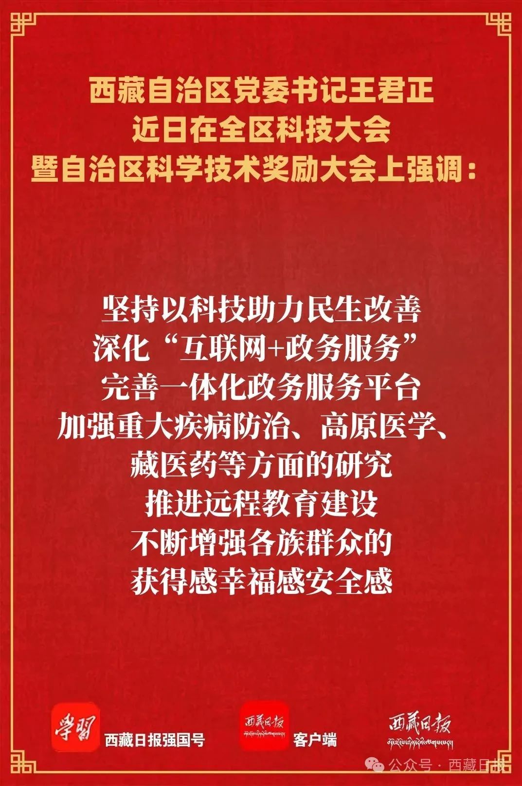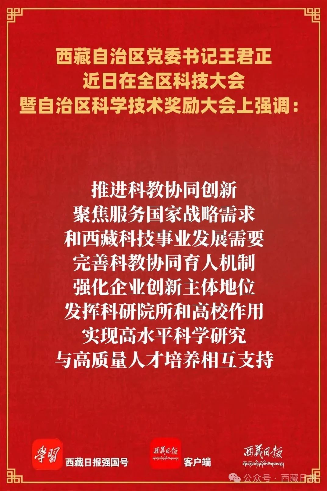 近日,全區(qū)科技大會(huì)暨自治區(qū)科學(xué)技術(shù)獎(jiǎng)勵(lì)大會(huì)在拉薩召開(kāi),自治區(qū)黨委書(shū)記王君正出席并講話。他強(qiáng)調(diào),要深入貫徹落實(shí)習(xí)近平總書(shū)記關(guān)于科技創(chuàng)新、西藏工作的重要指示和新時(shí)代黨的治藏方略,加快推動(dòng)科技事業(yè)發(fā)展,為社會(huì)主義現(xiàn)代化新西藏建設(shè)提供堅(jiān)實(shí)科技支撐。