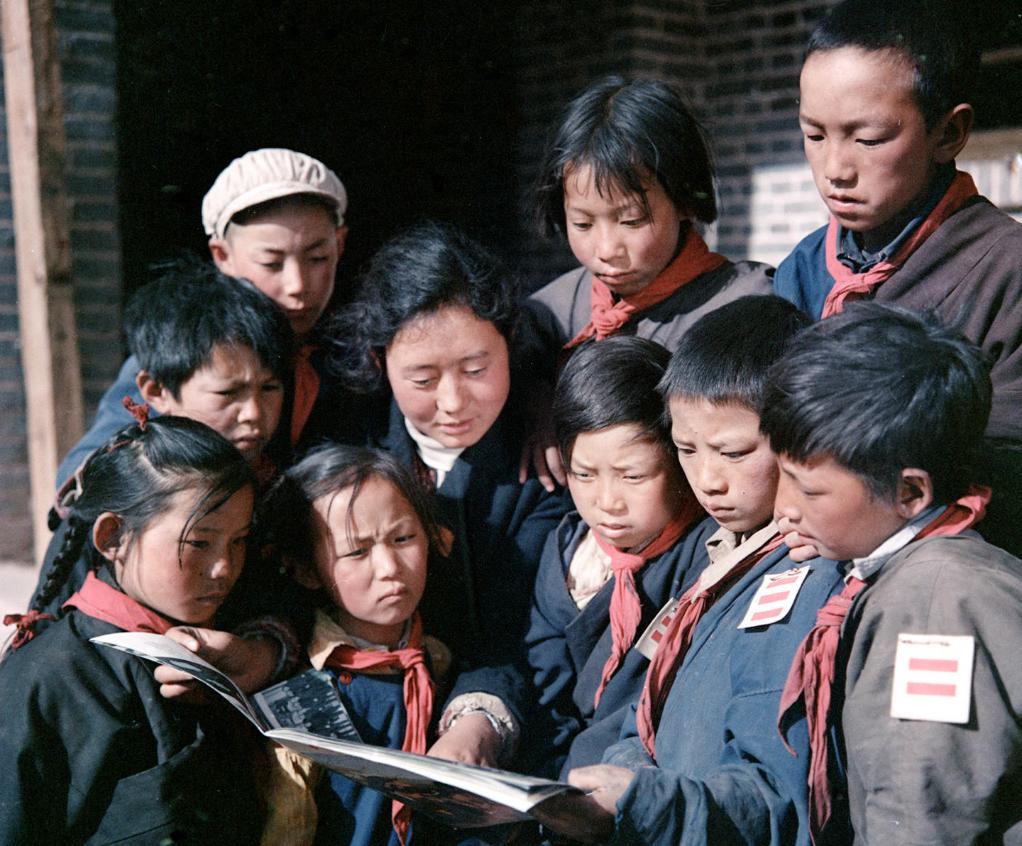 1965年9月,西藏昌都實驗小學的老師和學生在看畫報。新華社記者 馬競秋 攝