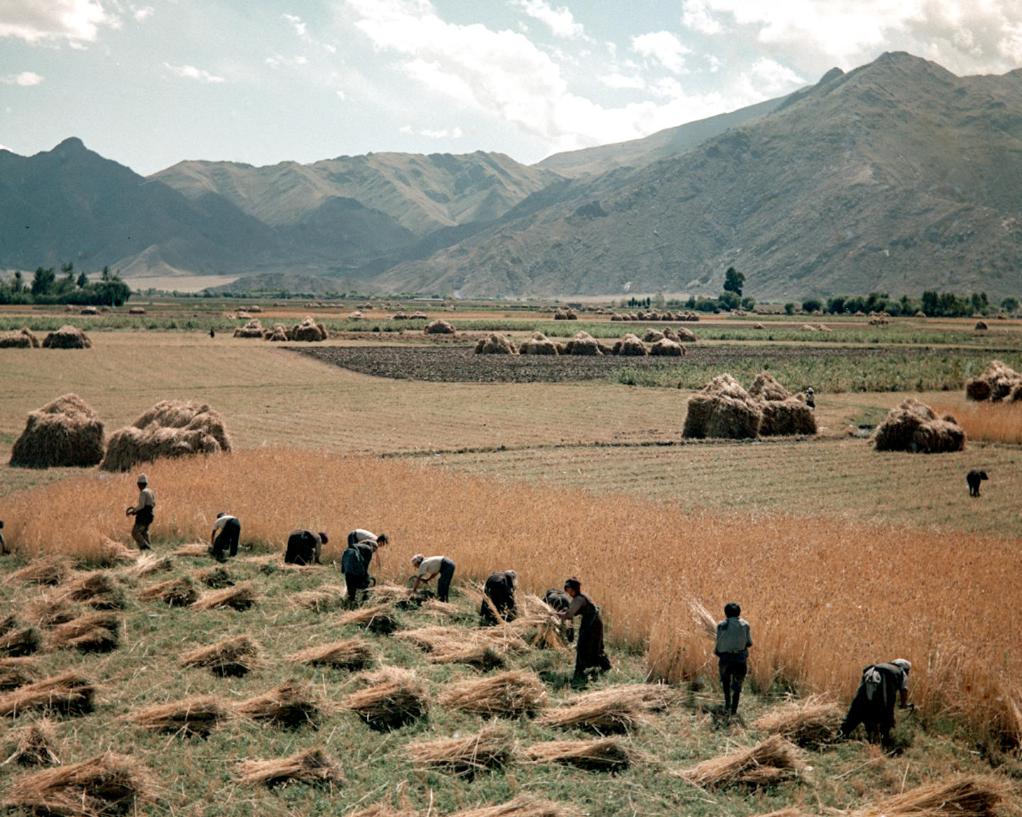 1965年8月,林芝縣(現(xiàn)為林芝市)立定鄉(xiāng)組織農(nóng)民收割青稞。新華社記者 馬競秋 攝