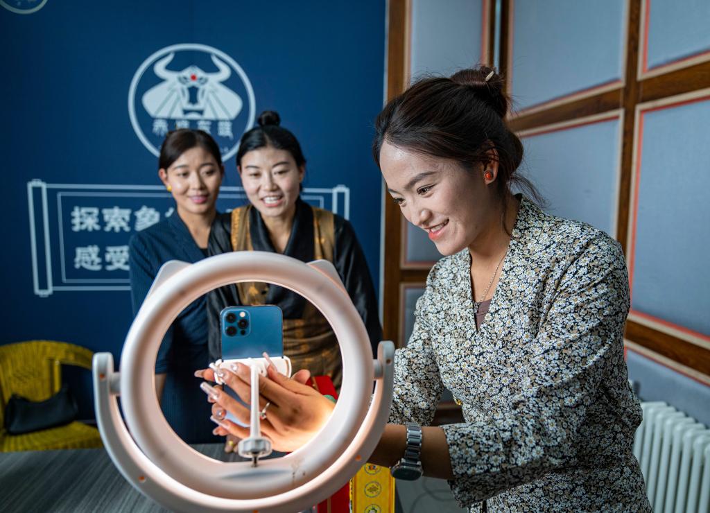2023年10月29日,在西藏那曲巴青縣“赤堆東雄”直播間,主播朗貢旺姆調(diào)試直播設(shè)備。新華社記者 孫非 攝