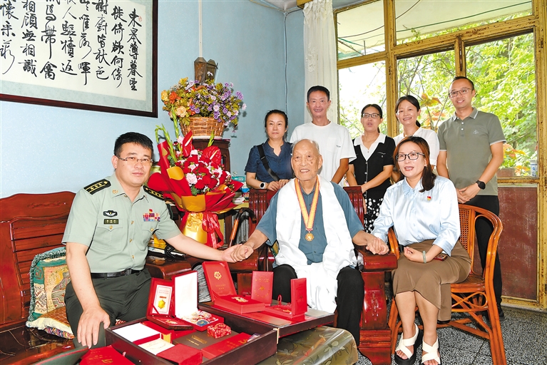 圖為工作人員向抗戰(zhàn)老戰(zhàn)土徐明亮(前排中)頒發(fā)紀(jì)念章。記者 洛桑 攝