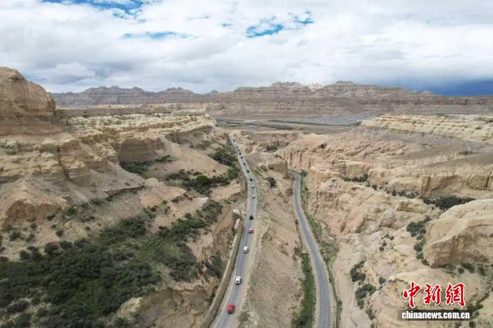 圖為9月2日,參加“天上阿里·云巔自駕”活動的游客車隊行駛在札達縣土林景區(qū)(無人機照片)。閆志國 攝